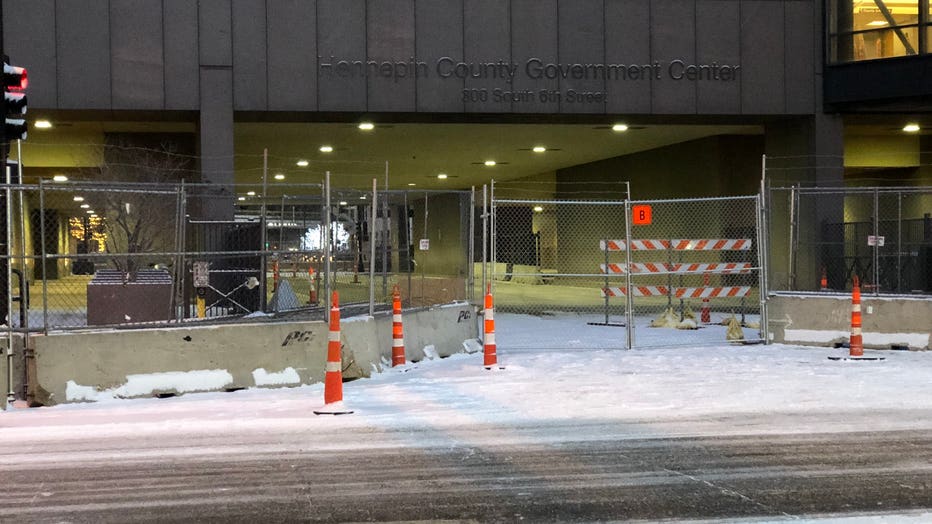 Extra security is in place at the Hennepin County Government Center as jury selection for the Derek Chauvin trial begins Monday, March 8, 2021. (FOX 9)