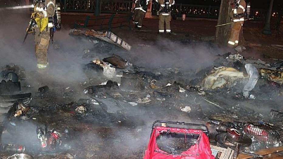 Firefighters responded to a fire at a homeless encampment in Kellogg Park early Friday morning. (St. Paul Fire Department / FOX 9)