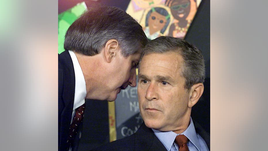 FILE - US President George W. Bush has his early morning school reading event interrupted by his Chief of Staff Andrew Card (L) on September 11, 2001, shortly after news of the New York City airplane crashes was available in Sarasota, Florida.