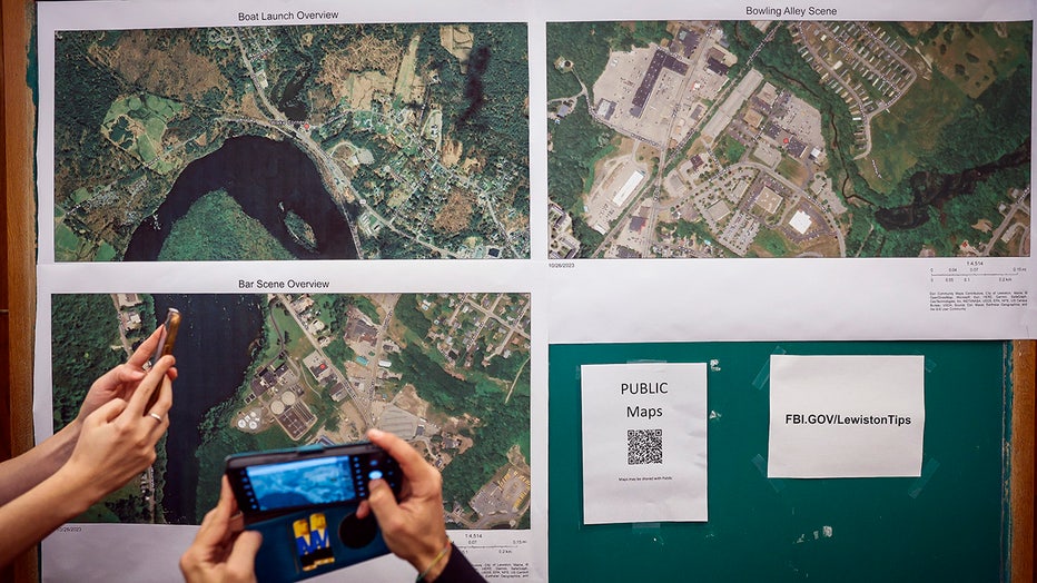 Members of the media take pictures of maps marking notable locations in the search for the Lewiston shooter on Friday during a press conference at Lewiston City Hall. (Erin Clark/Globe Staff via Getty Images)
