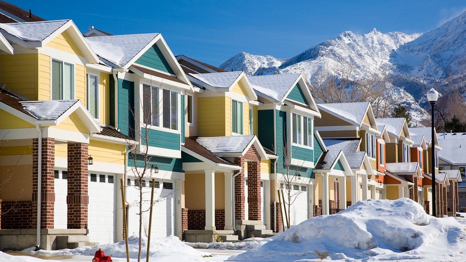 A row of townhouses under a blue sky. via Getty Images