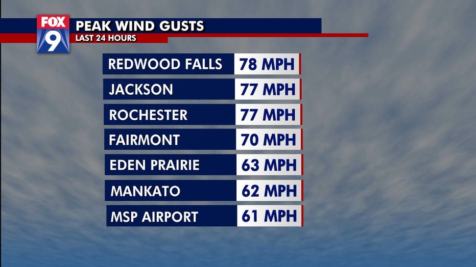 The severe line of storms in southern Minnesota from Rochester to Fairmont brought wind gusts of over 70 mph. A strong burst of wind with brief heavy snow hit along the Minnesota River in Redwood Falls, which recorded a peak wind gust of 78 mph.