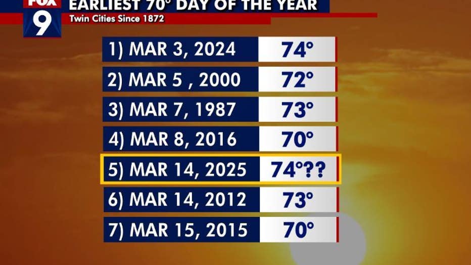 Friday could see record warmth with widespread highs in the 70s. The Twin Cities metro daytime high is expected to be around 74 degrees, just beating out the old record of 73 degrees set back in 2012.