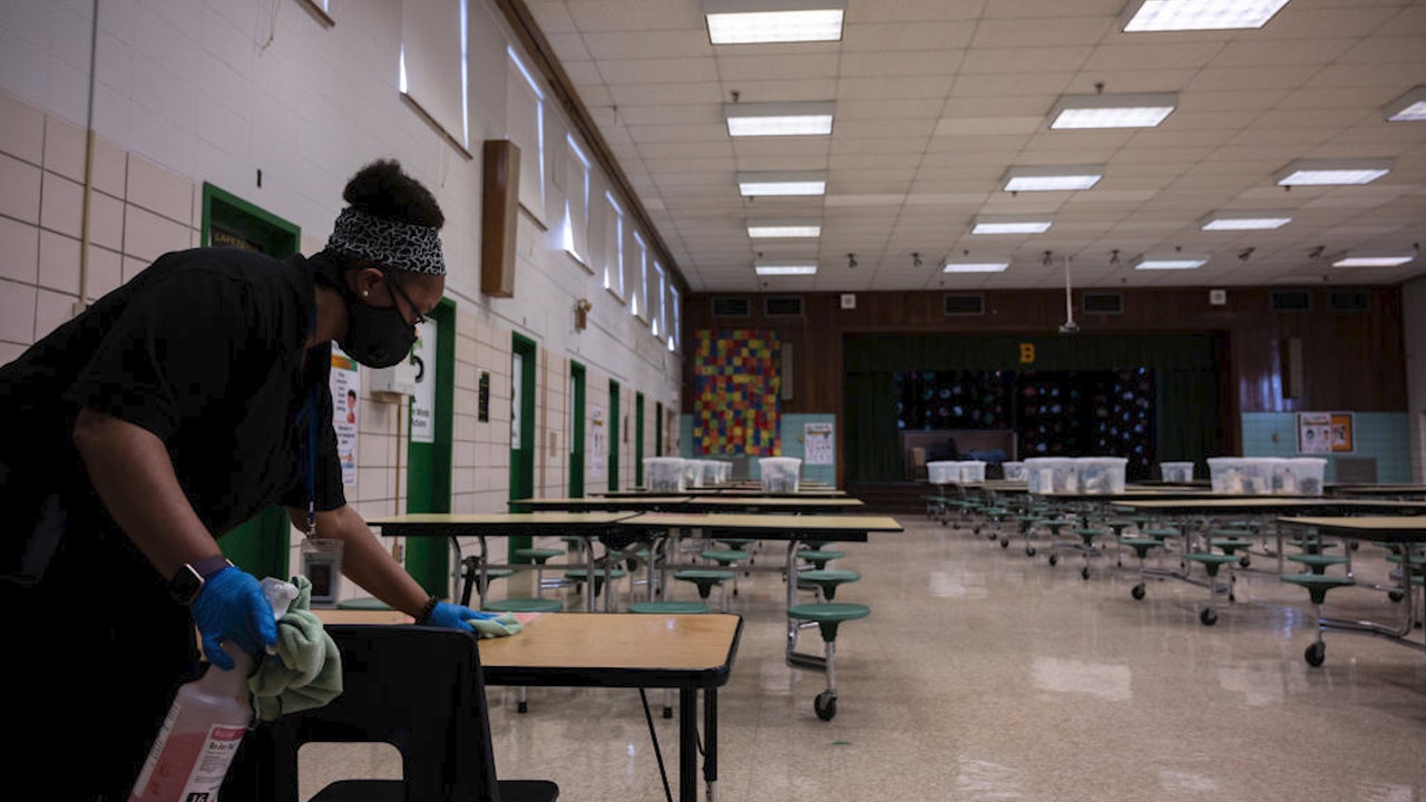 FILE - A member of Jefferson County Public Schools housekeeping staff, sanitizes a cafeteria table to display COVID-19 safety precautions at Byck Elementary School on March 12, 2021 in Louisville, Kentucky. ( Jon Cherry/Getty Images)