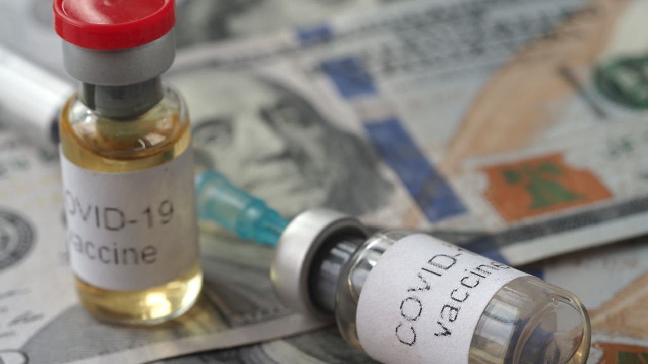 In this photo illustration (fake) vials labelled as COVID-19 vaccine and a syringe seen displayed on one hundred US dollar banknotes. (Photo Illustration by Igor Golovniov/SOPA Images/LightRocket via Getty Images)