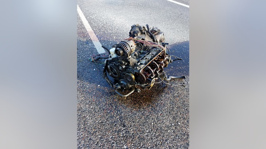 A engine lying in the road from one of the vehicles involved in a crash on Highway 169 in Plymouth, Minnesota Monday morning. (Plymouth Police Department / FOX 9)