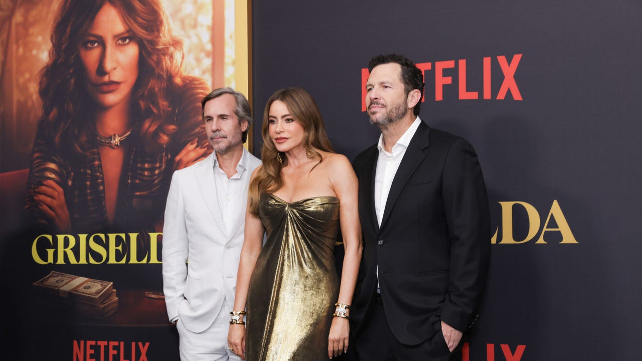 (L-R) Andrés Baiz, Sofía Vergara and Eric Newman attend the Miami premiere of "Griselda" at The Fillmore Miami Beach on January 23, 2024 in Miami Beach, Florida. (Photo by Mireya Acierto/WireImage)