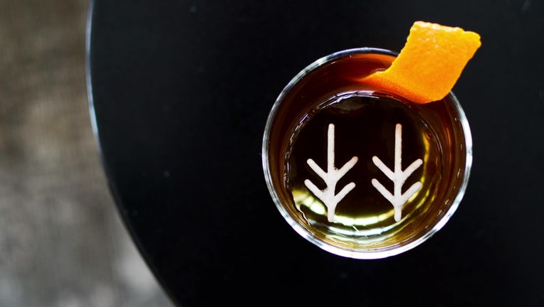 Hewing Hotel logo etched into an ice cube.