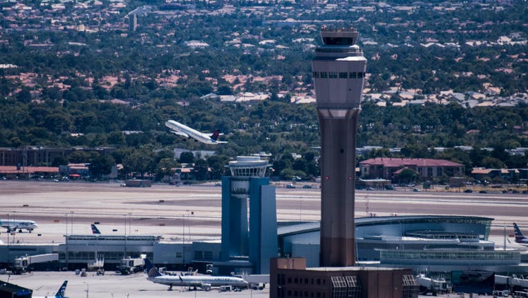 UNITED STATES - AUGUST 30: A Delta Airlines jet takes off behind the air traffic control tower at McCarran International Airport in Las Vegas, Nevada on Aug. 30, 2019. (Photo By Bill Clark/CQ-Roll Call, Inc via Getty Images)