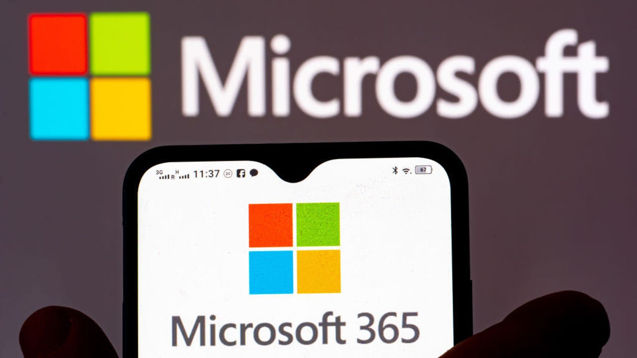 In this photo illustration, the Microsoft 365 logo is seen displayed on a smartphone and Microsoft logo in the background. (Photo Illustration by Igor Golovniov/SOPA Images/LightRocket via Getty Images)