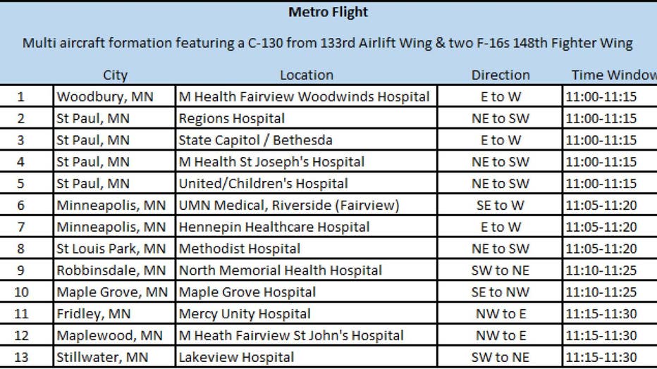 A flyover schedule for the metro on Wednesday. Times may vary. (Minnesota National Guard)