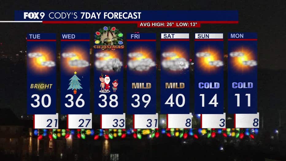 Expect a bright, quiet but slightly chilly Tuesday with highs in the 20s and 30s. FOX 9 meteorologist Cody Matz has the full forecast.