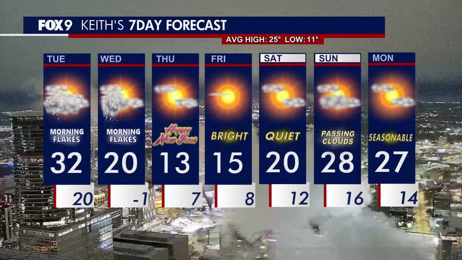 Light morning snowflakes will taper off as temperatures warm into the low 30s on Tuesday. FOX 9 meteorologist Keith Marler has the full forecast.
