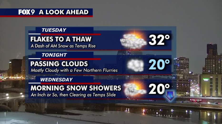 MINNEAPOLIS (FOX 9) - A quick round of morning snow gives way to milder temperatures across Minnesota on Tuesday.