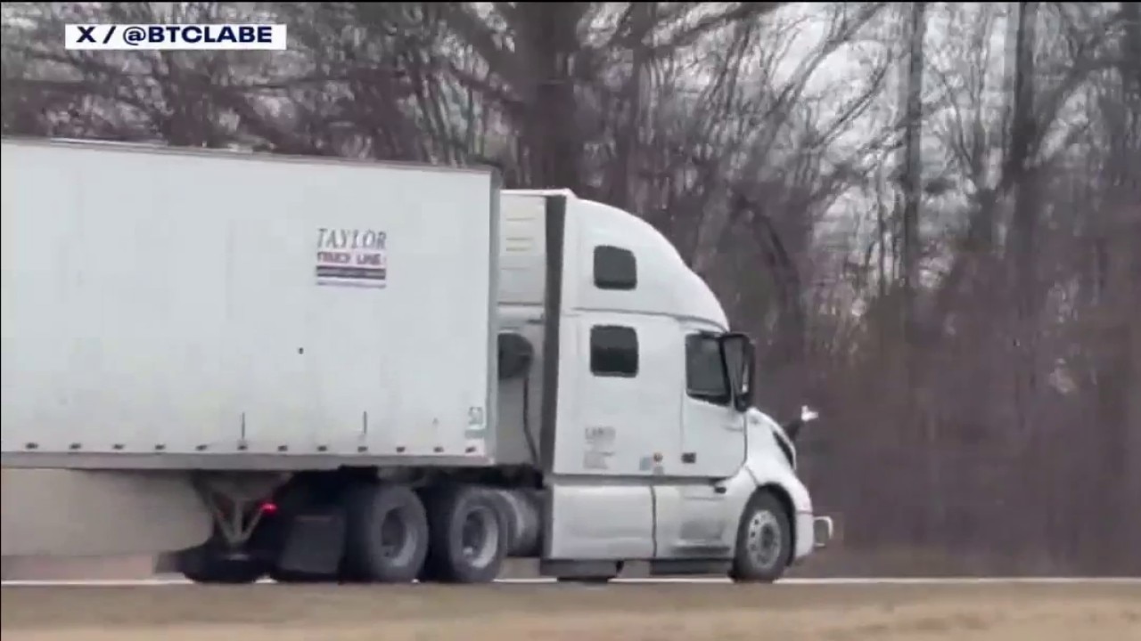 A video taken on a highway in Missouri shows a semi-truck traveling in the wrong direction with its flashers on.