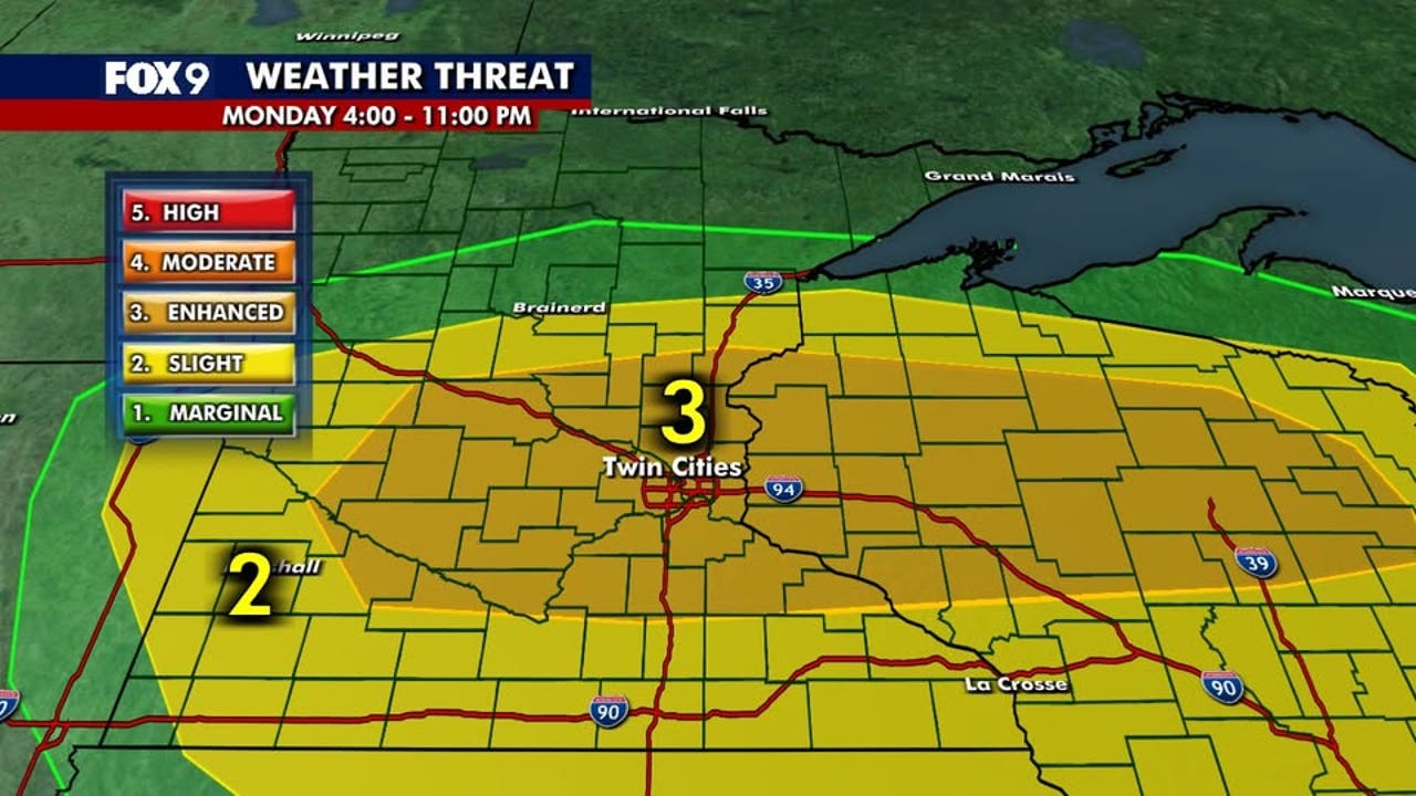 The Twin Cities metro, central and western Minnesota and western Wisconsin are at an Level 3 Risk (Enhanced) for severe weather from 4 p.m. to 11 p.m. Monday. Areas north and west of the metro, and far southern Minnesota are expected to be at a Level 2 Risk (Slight) for severe weather.