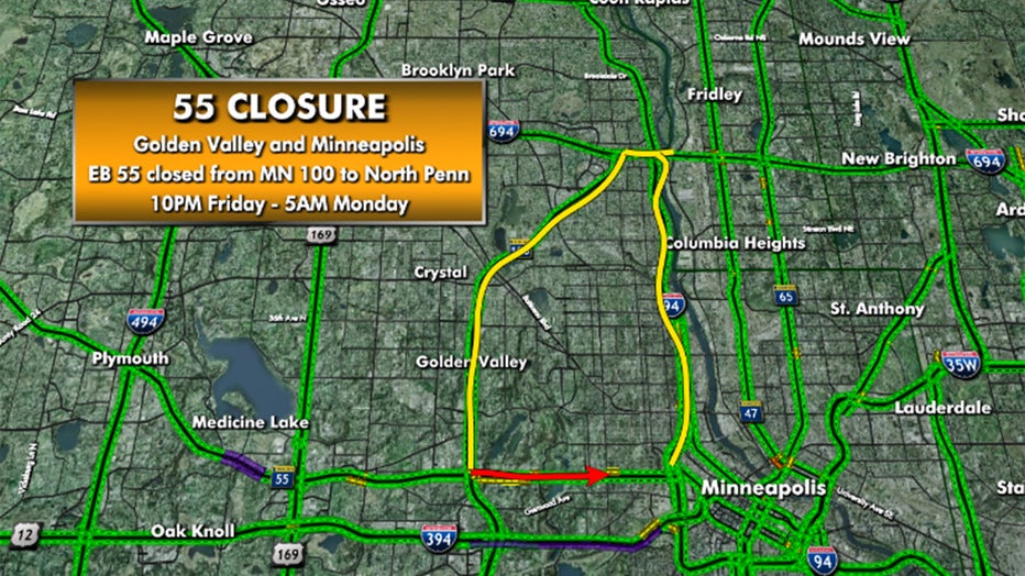 The eastbound lanes of Highway 55 will close from Minnesota Highway 100 in Golden Valley to North Penn Avenue in Minneapolis from 10 p.m. on Friday, Aug. 15 to 5 a.m. on Monday, Aug. 18. Click here for more information on that project, or take a look at the detour pictured below: