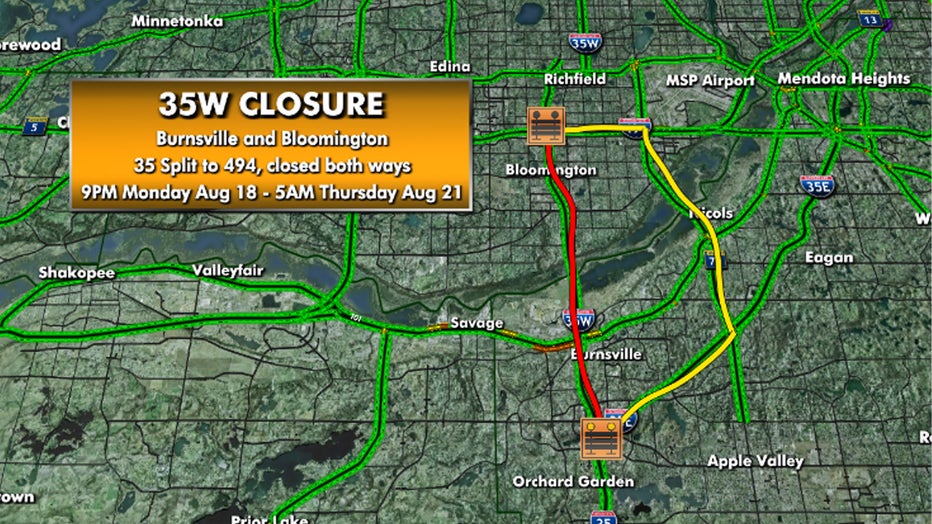 Interstate 35W (I-35W) will be closed in both directions through Burnsville and Bloomington, from the I-35 split to I-494, during the overnight hours between 9 p.m. and 5 a.m., from Monday Aug. 18 to Thursday Aug. 21. A detour for the closure can be found below, while information on that project can be found here.