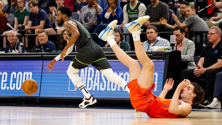 Mike Conley #10 of the Minnesota Timberwolves steals the ball from Josh Giddey #3 of the Oklahoma City Thunder in the fourth quarter of the NBA Play-In game at Target Center on April 14, 2023 in Minneapolis, Minnesota. (Photo by David Berding/Getty I