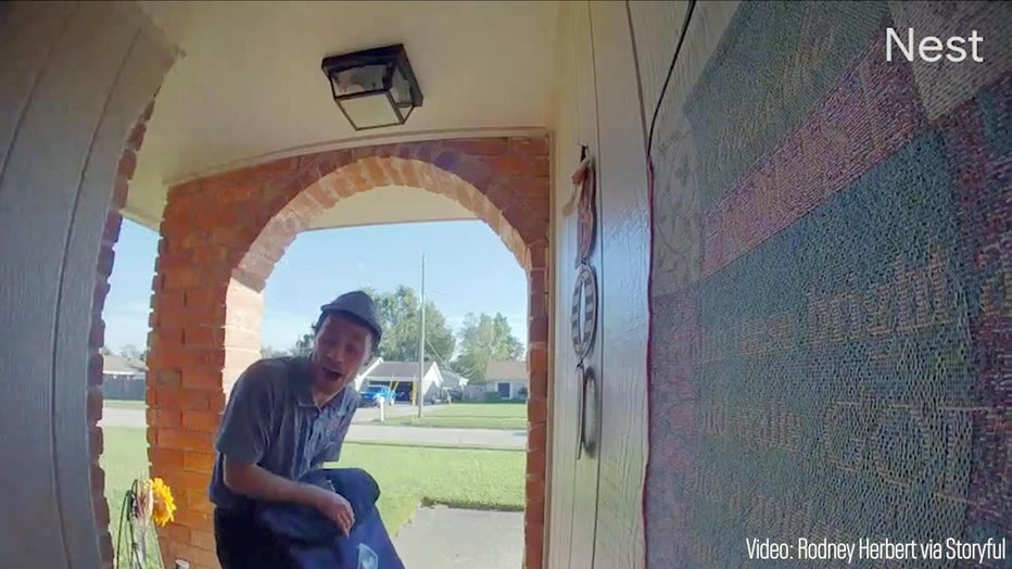 Wild footage from Rodney Herbert in Slidell, Louisiana, shows a pizza delivery driver walk up to the home not knowing a squirrel was hiding in a corner, apparently waiting for the chance to get inside.