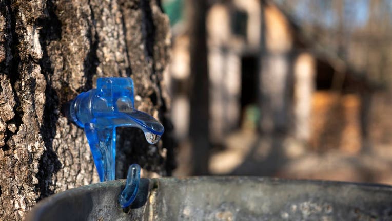 Sap from a maple tree drips from a tap into a bucket near the sugarhouse at Maple Moon Farm in Lebanon on Friday, March 19, 2021. (Staff photo by Gregory Rec/Portland Press Herald via Getty Images) (Getty Images)