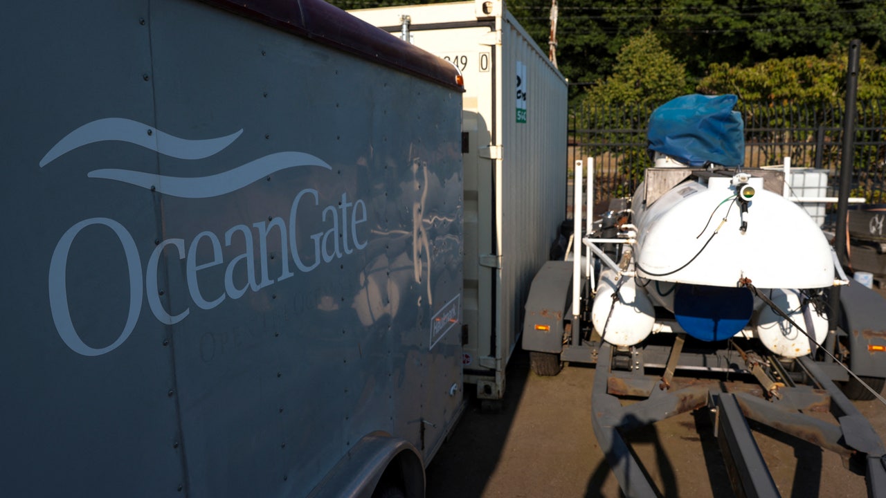A trailer featuring the OceanGate logo is pictured near a trailer and other equipment at OceanGate Expedition's headqurters in the Port of Everett Boat Yard in Everett, Washington, on June 22, 2023. All five people aboard a submersible missing near t