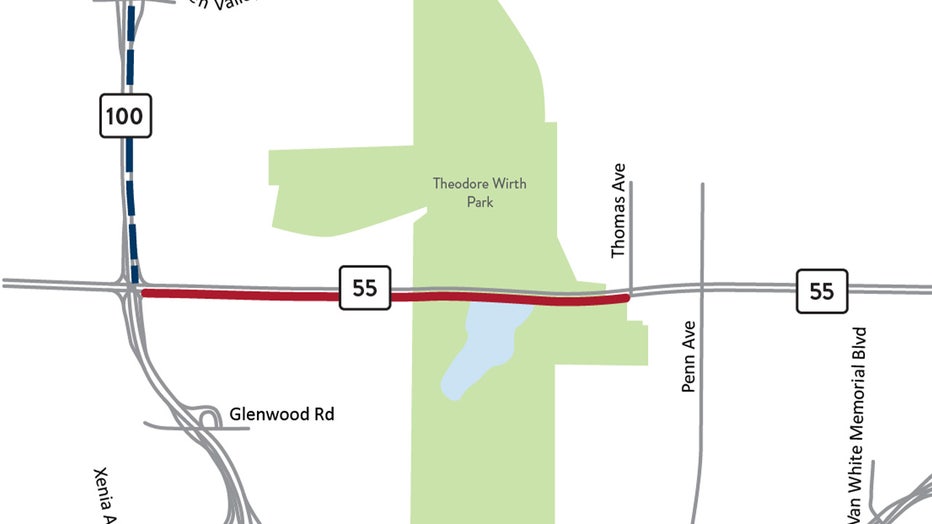 Highway 55 will be closed in both directions between Hwy 100 and Penn Avenue North in Golden Valley.