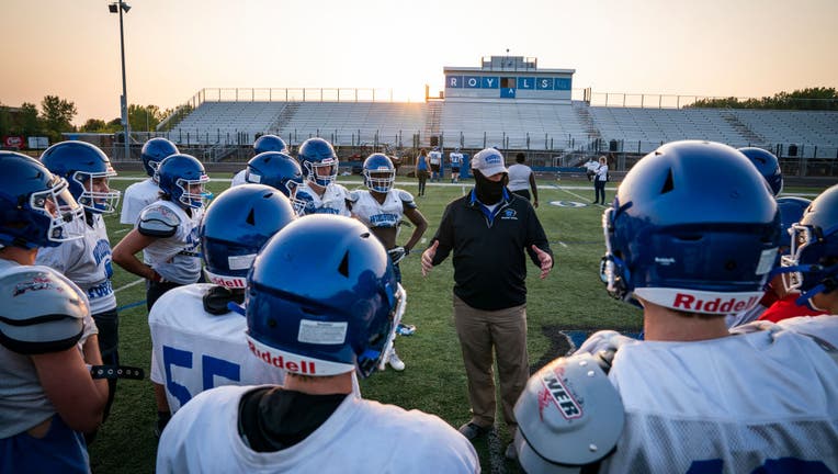 WOODBURY, MN,- SEPTEMBER 21 - Head coach Andy Hill wore a mask during Woodbury High School football practice. The Minnesota State High School League voted to allow football and volleyball teams to play for the fall season. (Photo by Leila Navidi/Star ((Photo by Leila Navidi/Star Tribune via Getty Images))