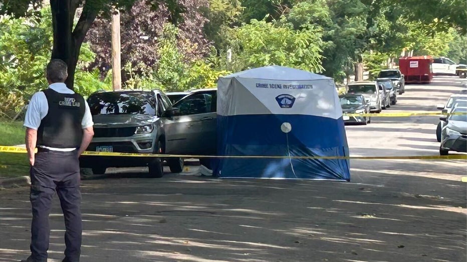 An image shot by a FOX 9 photographer shows a crime scene tent near a silver Jeep that appears to have been struck by gunfire.