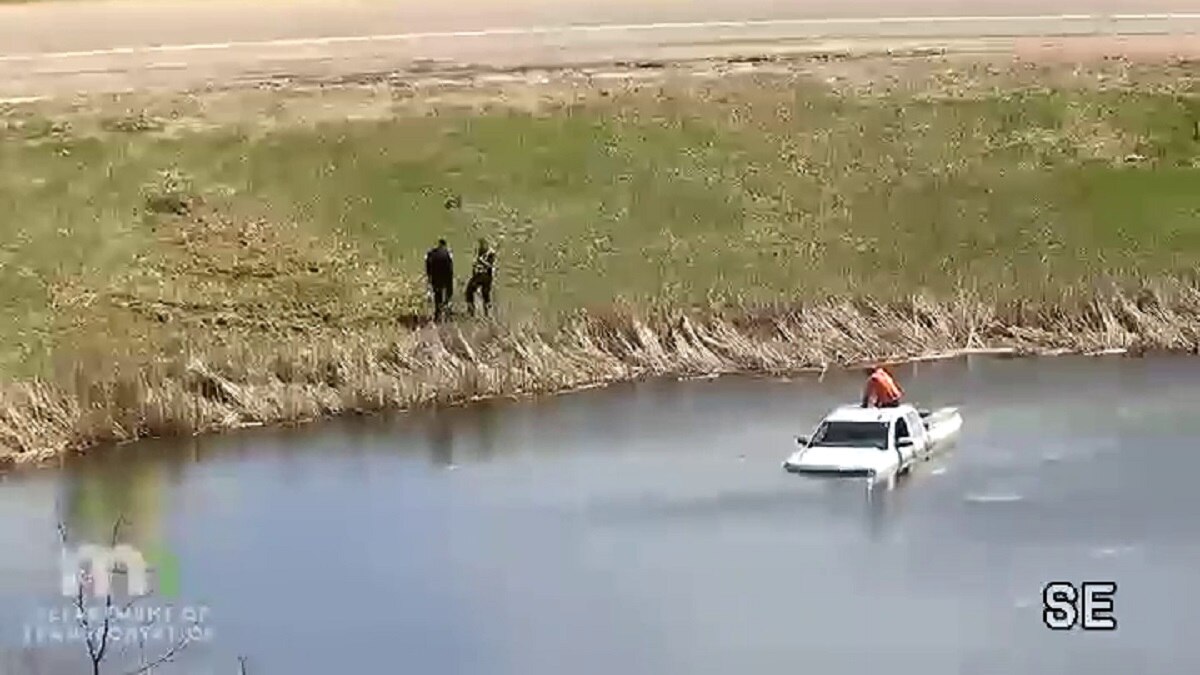 Video captured the moments as first responders helped pull a man stuck on the top of his truck from a pond after a crash on Tuesday, May 3, 2022.