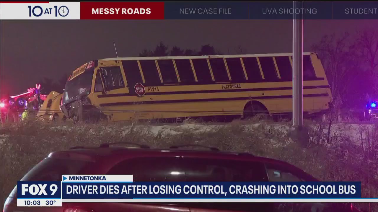 A collision between a school bus and an SUV in Minnetonka on Monday has left one person dead, troopers say. The crash happened on westbound Highway 62 near Shady Oak Road, just over the border from Eden Prairie, around 4 p.m.