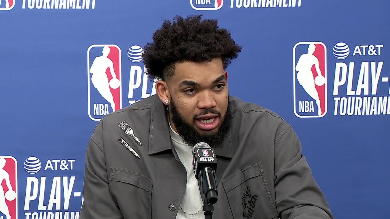 Karl-Anthony Towns and Rudy Gobert speak with reporters after a 120-95 win over the Oklahoma City Thunder Friday night at Target Center to earn the No. 8 seed in the Western Conference Playoffs.