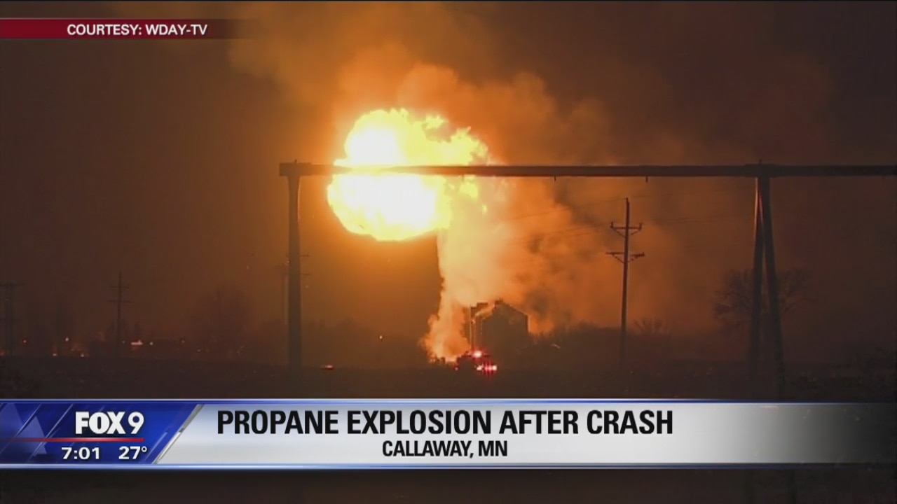 Video: WDAY-TV. Overnight explosion at the scene of a propane truck and freight train crash in Callaway, Minnesota.