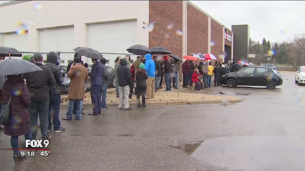 At least 300 people were in line Thursday morning in Eden Prairie, Minn. to pay $1,000 to reserve the new Tesla Model 3. Doors opened at 10 a.m. for eager buyers, but some camped out overnight.