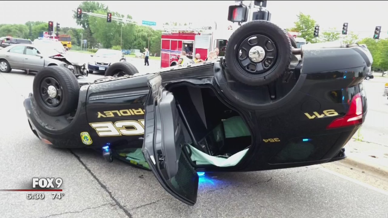 A Fridley squad car in pursuit of a red light runner was flipped onto its roof when it was t-boned by another car at the intersection of University Avenue Mississippi Street NE. The crash happened at about 8:10 a.m. Friday.