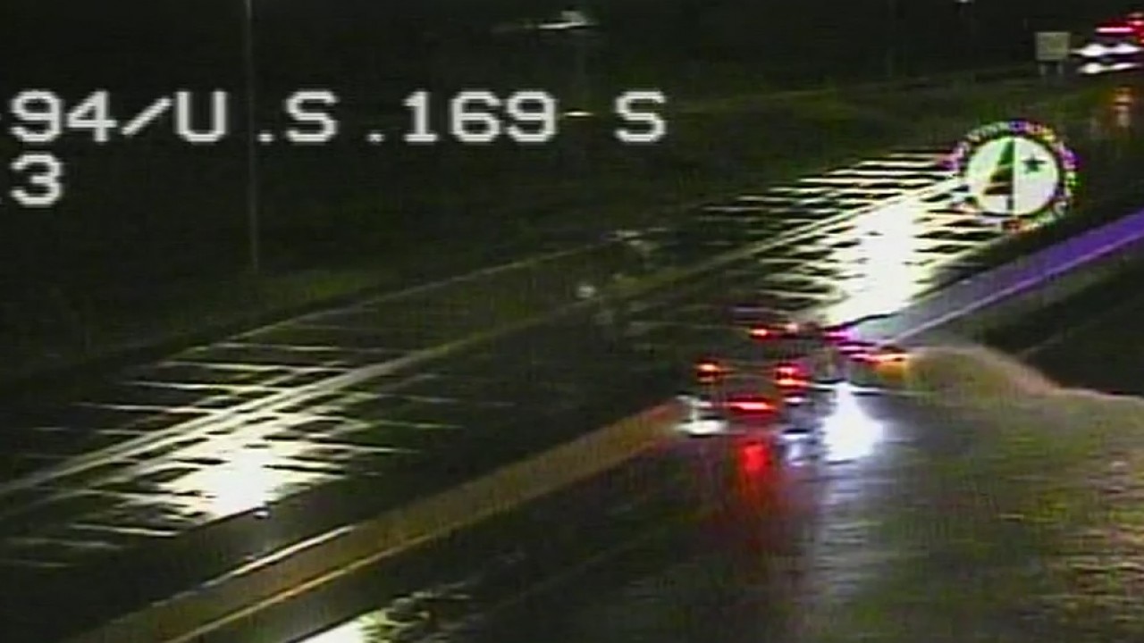 A snow plow clears flood water from I-94 in Maple Grove, Minnesota.