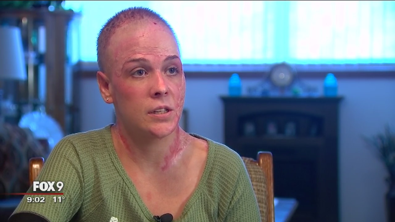 A mother of three from Alexandria, Minnesota is back home after being badly burned in a house fire in December.