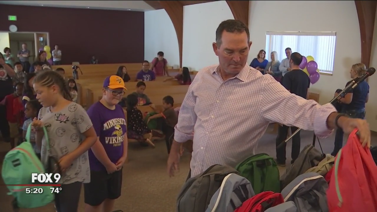 Vikings coach Zimmer hands out backpacks to kids at Salvation Army in St. Paul