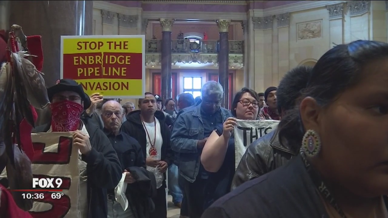 Soon after the fight against the Dakota Access Pipeline, environmental activists are resisting plans for a new project that would run from Canada to Superior, Wisconsin through northern Minnesota. Cell phone video captures protesters climbing on construction equipment in Superior, the end point of a planned pipeline by Enbridge Energy.