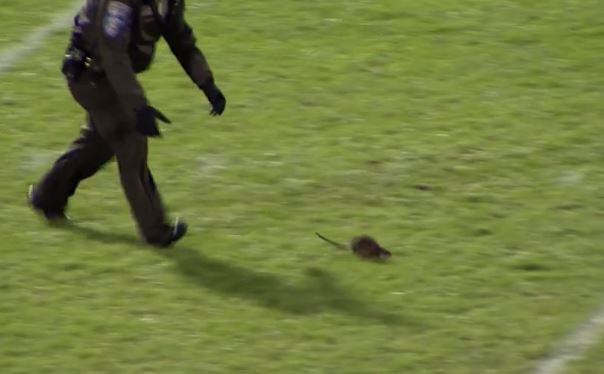 An officer from the Anoka County sheriff's department caught a muskrat that was running loose on the football field during a game Friday night.