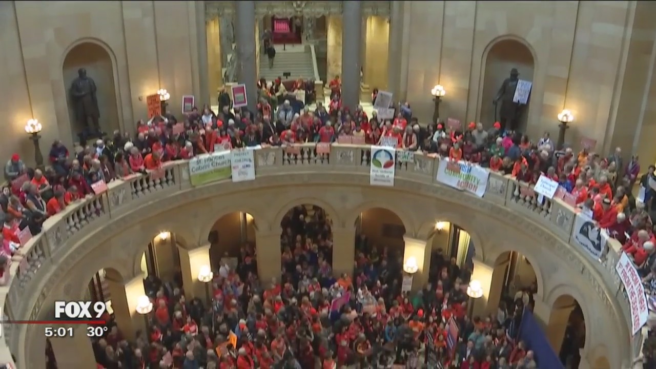Wearing bright orange t-shirts, the anti-gun violence alliance called Protect Minnesota flooded all three floors of the State Capitol on Thursday to push for new gun safety laws this session.