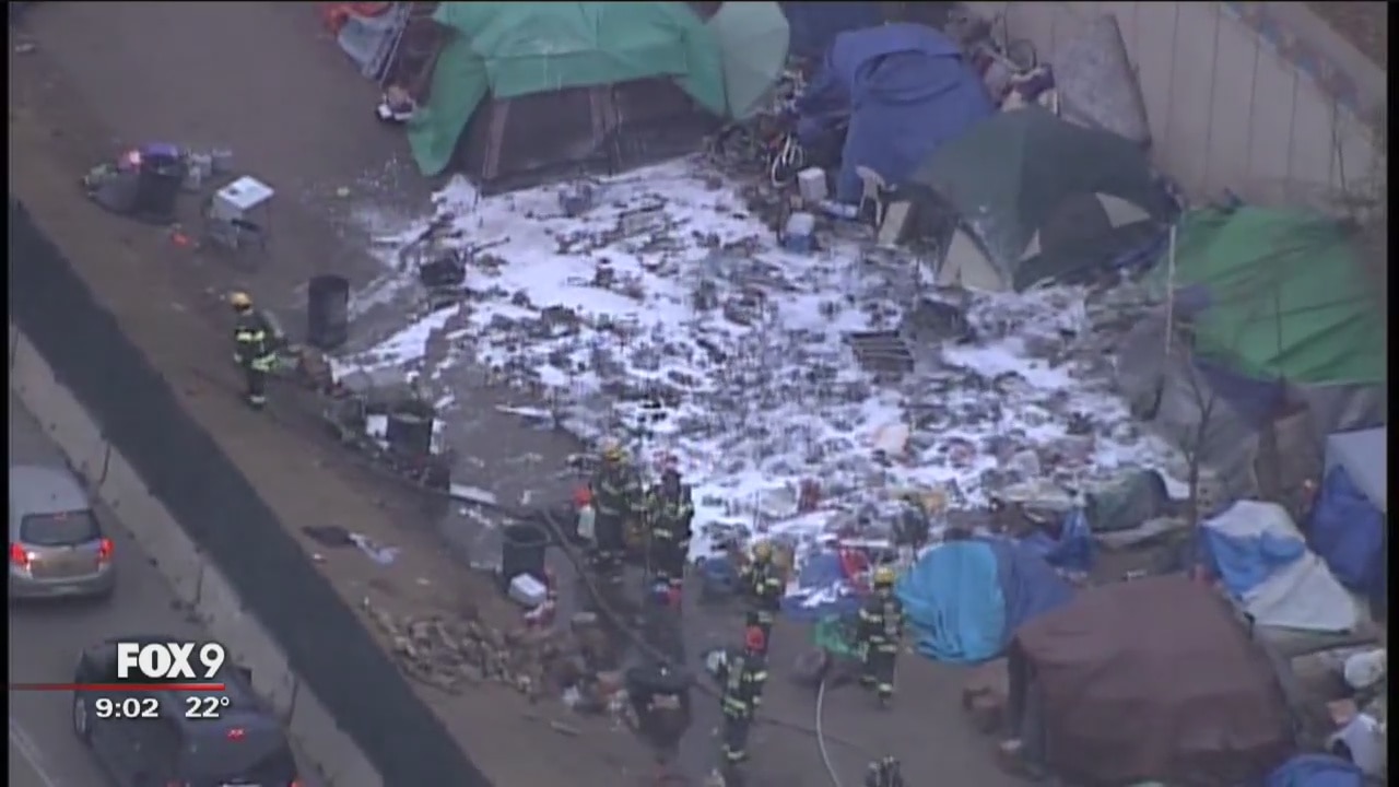 Minneapolis firefighters responded to a fire at the homeless encampment in south Minneapolis Monday afternoon.