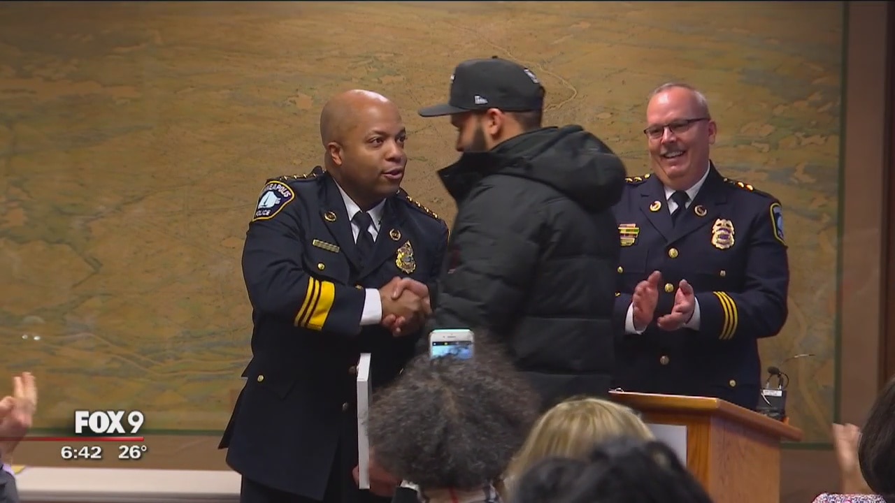 Minneapolis police officers honored a man, who is being credited with saving a woman from an attempted rape, as part of the department?s awards ceremony.