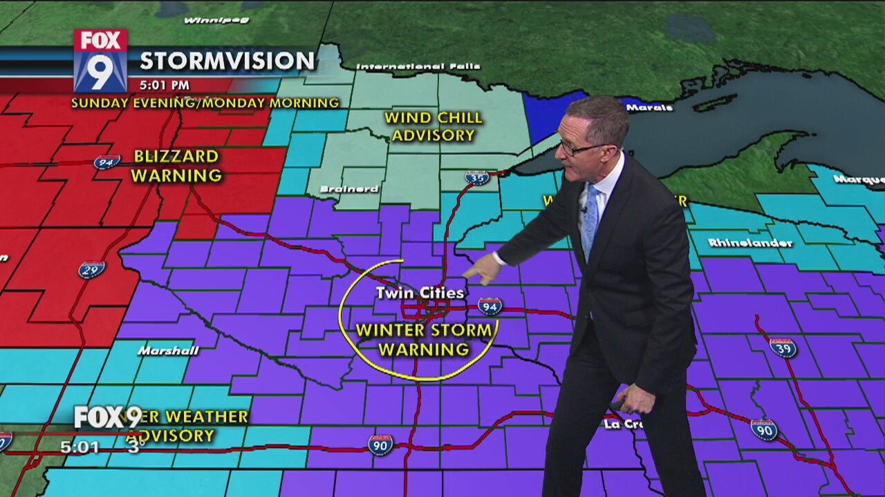 A Winter Storm Warning may dump 6 or more inches of snow on the Twin Cities area overnight Sunday