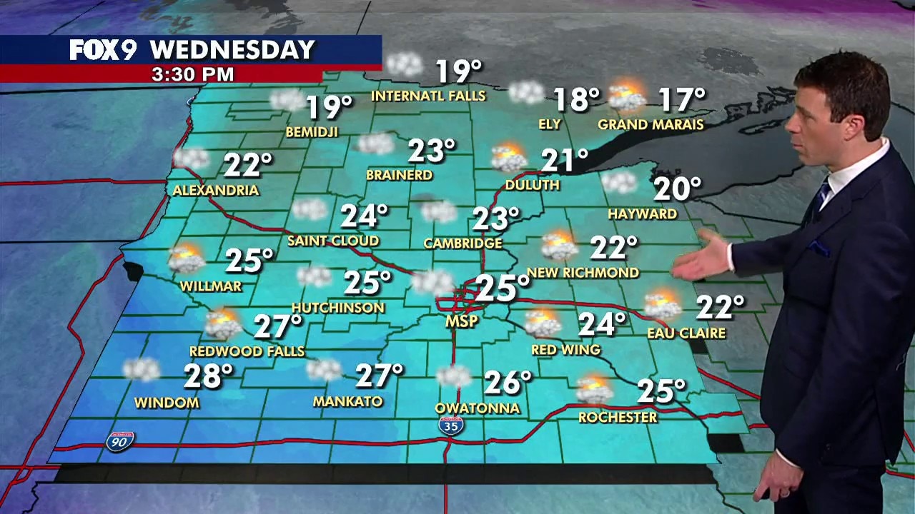 More seasonable temperatures in the mid-20s return on Wednesday, though it also comes with fairly cloudy conditions. FOX 9 meteorologist Cody Matz has the full forecast.
