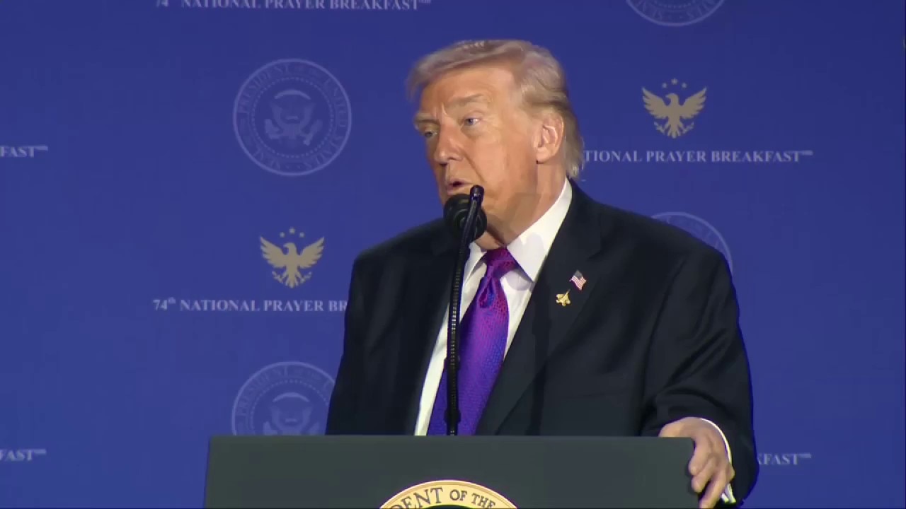 President Donald Trump on Thursday, during a national prayer event, discussed the arrests of people involved in an anti-ICE protest at a St. Paul church in January.