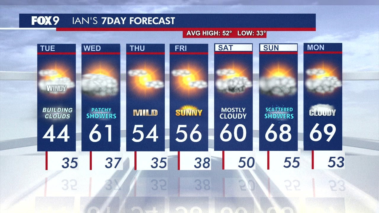 FOX 9 Meteorologist Ian Leonard has you Monday evening forecast. We'll have one more day of cooler temperatures before it feels more like spring later this week, and our next chance for precipitation comes Wednesday.