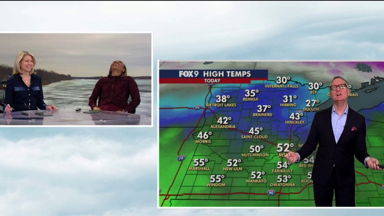 FOX 9 Meteorologist Ian Leonard gives anchor Symone Woolridge a hard time after she complains about it being wet outside as the snow melts due to our mild temperatures.