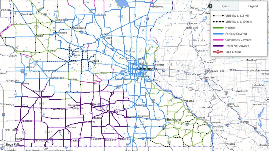 The National Weather Service reports that roads in western Minnesota are already covered, with visibility down a half a mile or less. The weather conditions will continue to move east throughout the morning.