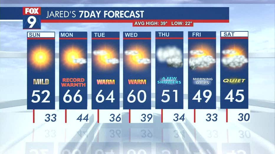 MINNEAPOLIS (FOX 9) - Sunday will be sunny and not as windy, causing temperatures to feel warmer at the start of the week in Minnesota. Following warmer temperatures on Sunday, Monday could bring some possible record warmth.